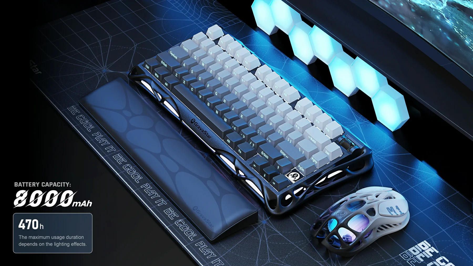 Клавіатура підтримує три режими підключення – дротове USB-C, Bluetooth та бездротове з’єднання 2.4 ГГц. Вбудований акумулятор ємністю 8000 мАг забезпечує тривалу автономність і швидко заряджається через USB-C. Дві незалежні RGB-системи з настроюваними ефектами дозволяють створювати власну атмосферу, надаючи робочому простору виразного характеру.