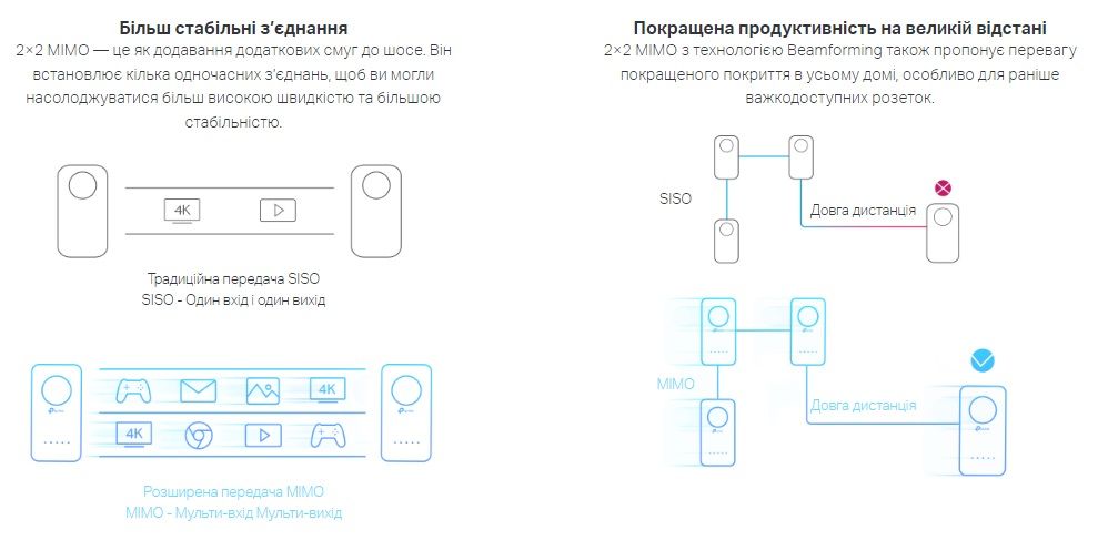 - 2 × 2 MIMO - Встановлює кілька одночасних з’єднань, щоб насолоджуватися високою швидкістю електромережі та більшою стабільністю.