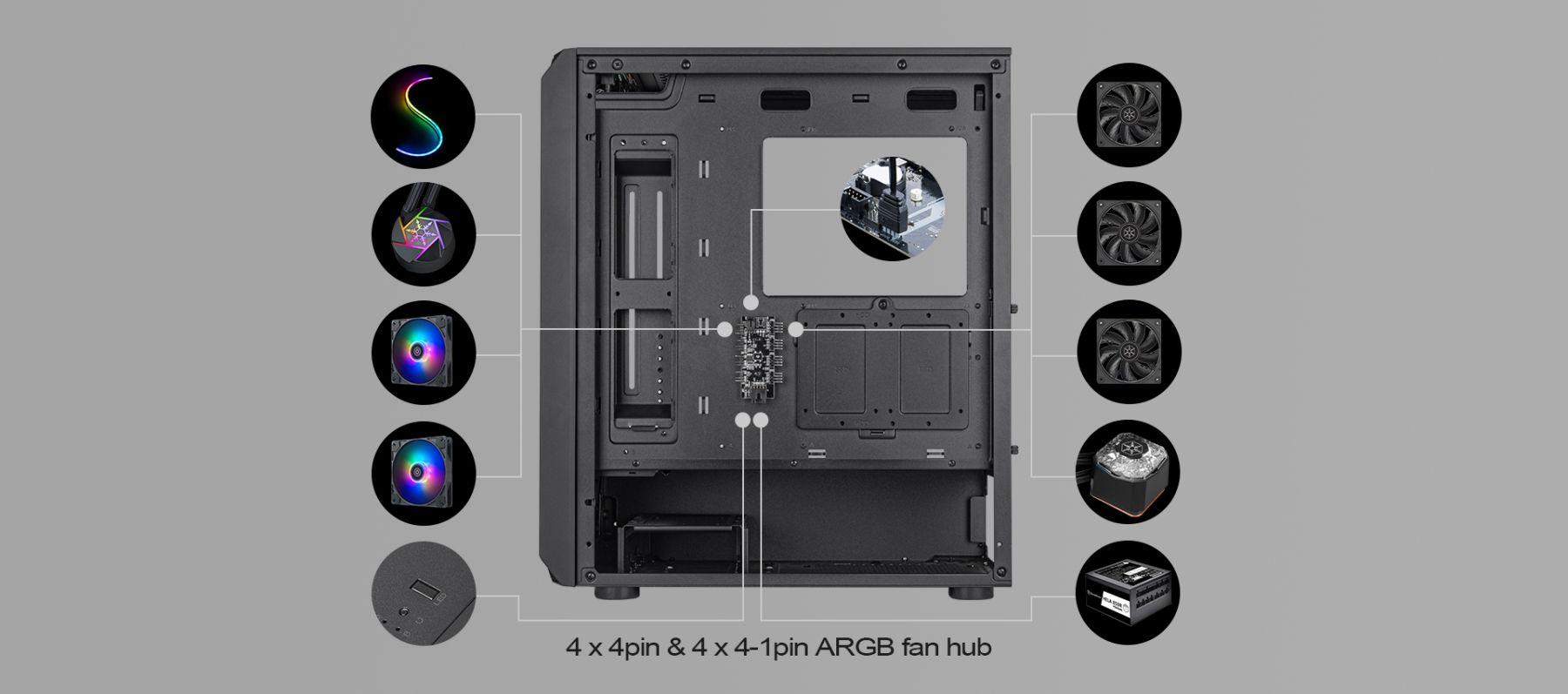 Передня панель має 2 світлові смуги ARGB, які підсвічують усю панель, а вентилятори з підсвічуванням ARGB, що входять до комплекту, створюють вражаючу естетичну ауру для корпусу з високою продуктивністю повітряного потоку.