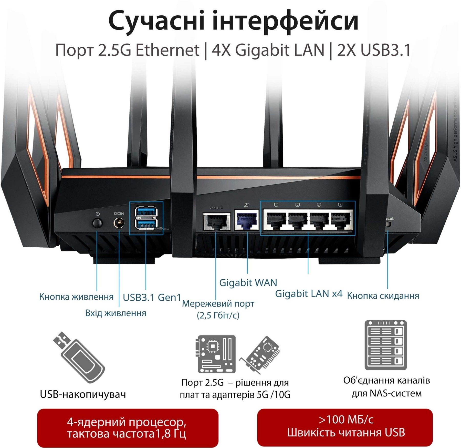 Особливості:Підтримка IPTV, QoS, Підтримка технології Beamforming, MU-MIMO, Діагностика: графічна карта мережі, Гостьова мережа, AiProtection Pro, Adaptive QoS, 1024-QAM high data rate, 20/40/80/160 MHz bandwidth, Підтримка хмарної платформи AiCloud, Traffic Analyzer, Управління смугою пропускання, Додаткові сервіси: персональний хмарний сервіс AiCloud, FTP і Samba файловий сервер, принт-сервер, підтримка USB 3G-модемів, вбудований Download Master, медіа-сервер, Додаткові можливості Wi-Fi: вкл / викл. радіомодулів, IGMP Snooping, бездротовий планувальник, Додаткові можливості доступу: перемикач портів, переадресація (форвардного) портів, DMZ, DDNS, проходження через NAT з'єднань PPTP, L2TP, IPSec, RTSP, H.323, SIP та ретрансляція PPPoE, Вбудовані мережеві утиліти: ping, traceroute, nslookup, netstat, Wake-on-LAN, резервне копіювання для MacOS, підтримка VPN-тунелів, WTFast Gamers Private Network, Roaming Assist, Діагностика: вбудовані мережеві утиліти, Кілька режимів роботи: бездротовий маршрутизатор, точка доступу, медіа-міст, AiMesh, Smart Connect, Link Aggregation 802.3ad