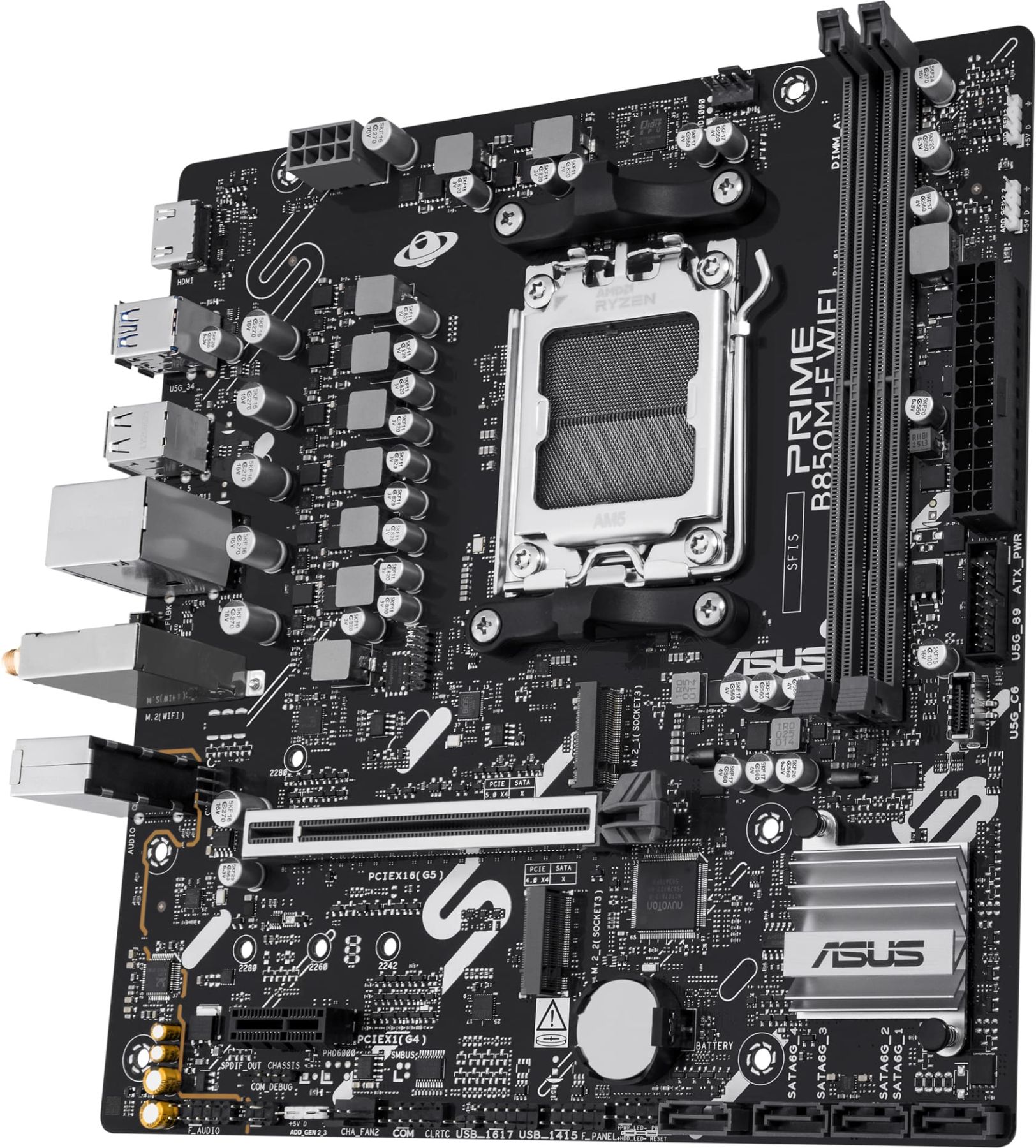 ASUS PRIME B850M-F WIFI побудована на чипсеті AMD B850 та підтримує процесори Ryzen серій 7000, 8000 і 9000 з теплопакетом до 120 Вт. Два слоти DDR5 дозволяють встановити до 128 ГБ оперативної пам’яті з високими робочими частотами. Для зберігання даних передбачено два роз’єми M.2, включно з підтримкою PCIe 5.0, а також чотири порти SATA. Основний слот PCIe 5.0 x16 забезпечує сумісність із сучасними відеокартами. Інтегровані бездротові модулі розширюють можливості підключення.