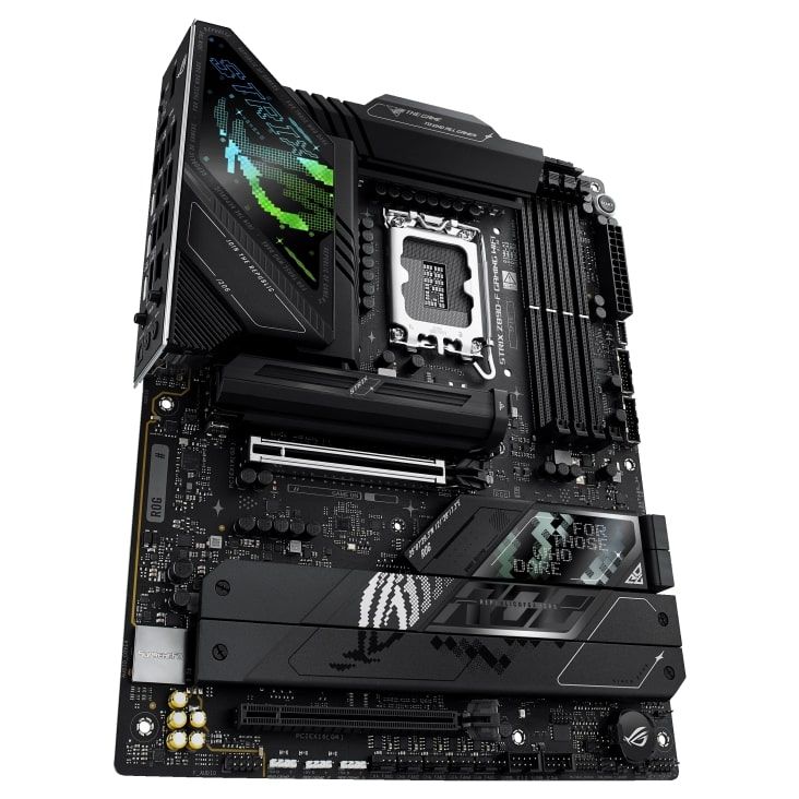 ROG Strix Z890-F має витончений і стриманий дизайн, що забезпечує бездоганну інтеграцію з широким спектром системних компонентів. Його глибока чорна поверхня та відповідні металеві радіатори створюють темний, насичений вигляд, а підсвічування Polymo на панелі вводу/виводу пропонує настроювані RGB-ефекти - так що ви можете вибрати між витонченим зовнішнім виглядом і сміливою, яскравою заявою, що привертає увагу.