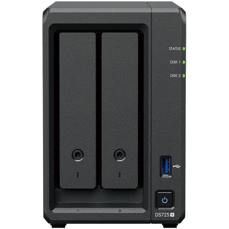 DS725+ оснащений вбудованою мережею 2.5GbE і підтримує як SATA SSD, так і HDD форматів 2.5 та 3.5 дюймів у внутрішніх відсіках, а також диски M.2 NVMe через слоти M.2 для використання в якості кешу.
