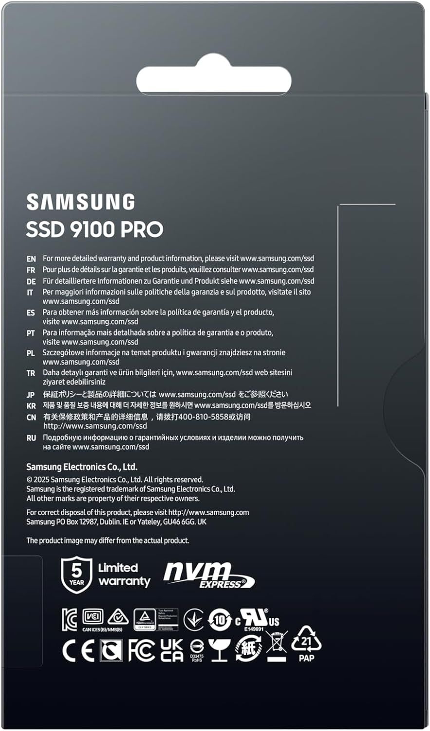 Samsung 9100 PRO 4TB (MZ-VAP4T0BW) — це твердотільний накопичувач формату M.2 2280, який використовує інтерфейс PCIe 5.0 x4 та протокол NVMe 2.0 для досягнення максимальних швидкостей передачі даних. Завдяки використанню фірмової пам'яті Samsung V-NAND TLC та власного контролера, цей SSD забезпечує стабільну та надійну роботу навіть при інтенсивних навантаженнях.