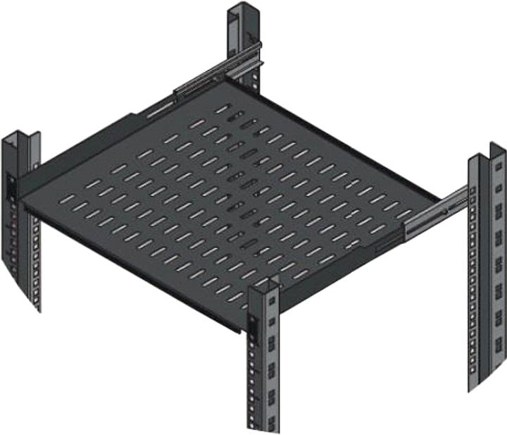 Полиця MIRSAN консольна 19" 1U 450. Полиця з фіксацією на фронтальні та тильні швелери. З регульованою глибиною фіксації. Перфорована для вентиляції. Навантажувальна здатність 50 кг.