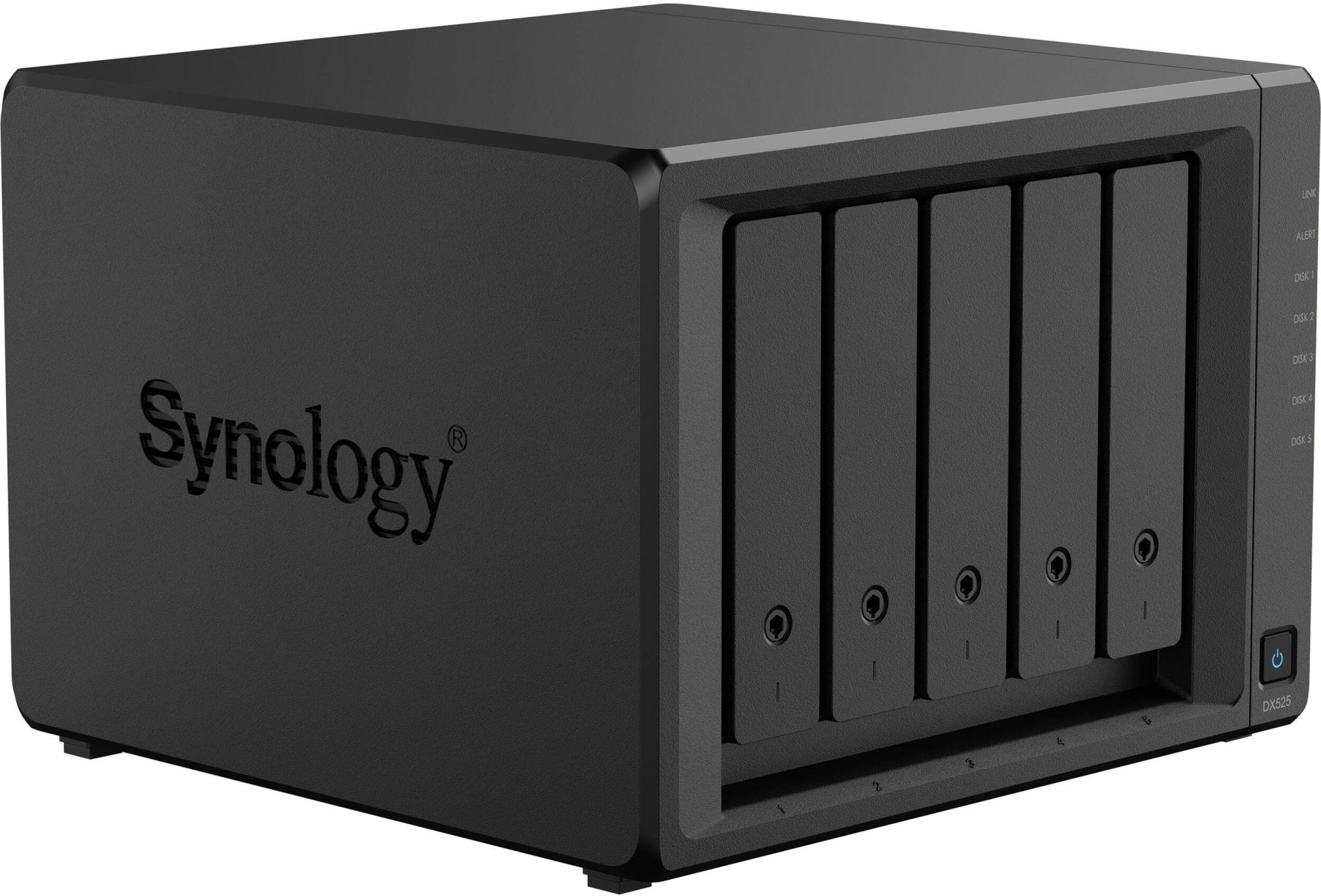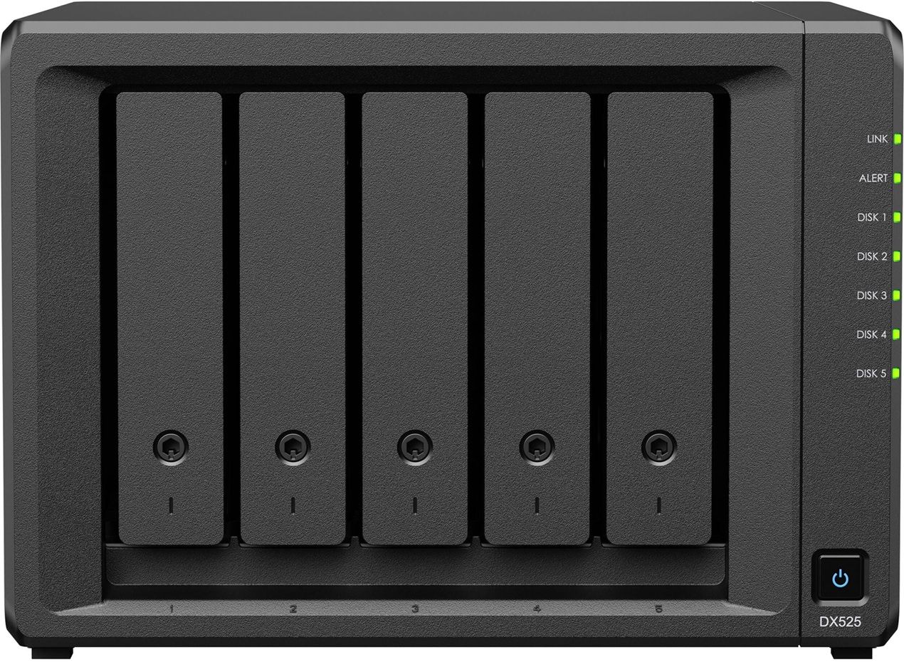 Synology DX525 — це надійне рішення для розширення сховищ даних без зупинки роботи системи. Пристрій оснащений п’ятьма відсіками для 3,5″ або 2,5″ накопичувачів і підтримує гарячу заміну. Корпус виконаний у компактному форматі, працює з низьким рівнем шуму 20,4 дБ і споживає мінімальну кількість енергії. Живлення та керування синхронізуються з головним NAS, що гарантує стабільність і довговічність роботи.