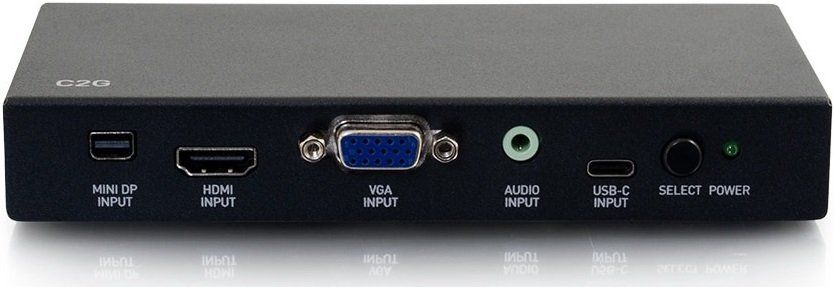 Перемикач C2G HDMI на USB-C HDMI Mini DP VGA CG81850. Перемикач перехідника HDMI, USB-C, Mini DisplayPort і VGA HDMI був розроблений для підключення в додатках, де проектор або дисплей мають тільки вхід HDMI. Цей перемикач перетворювача усуває потребу в додаткових адаптерах і дозволяє проектору або дисплею залишатися на одному вході для всіх підключених пристроїв. Завдяки одному виходу HDMI та автоматичному перемиканню немає потреби перемикатися між кількома входами на дисплеї.