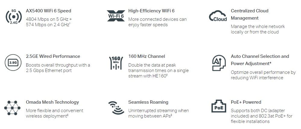Додатково:OFDMA, Beamforming, кріплення на стелю/на стіну, Кілька SSID (до 16 SSID, по 8 для кожного діапазону), Статистика бездротового зв’язку на основі SSID/AP/клієнта, Omada App