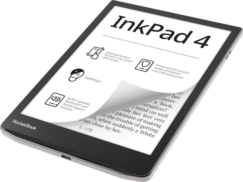 Встроенный динамик, Text-to-Speech и другие аудиофункции PocketBook InkPad 4 поддерживает 6 аудиоформатов и оснащен встроенным динамиком. Это приносит новый уровень свободы всем ценителям аудиокниг, так как теперь любой аудиофайл можно слушать прямо на ридере, без каких-либо сторонних устройств. А благодаря Bluetooth ридер всегда можно подключить к беспроводным наушникам, колонкам и другим аудиосистемам, чтобы наслаждаться аудиокнигой в удобном для вас формате. Благодаря функции Text-to-Speech, всего лишь 2 клика, и PocketBook InkPad 4 прочитает вслух любой текстовый файл естественным голосом на одном из 26 доступных языков.