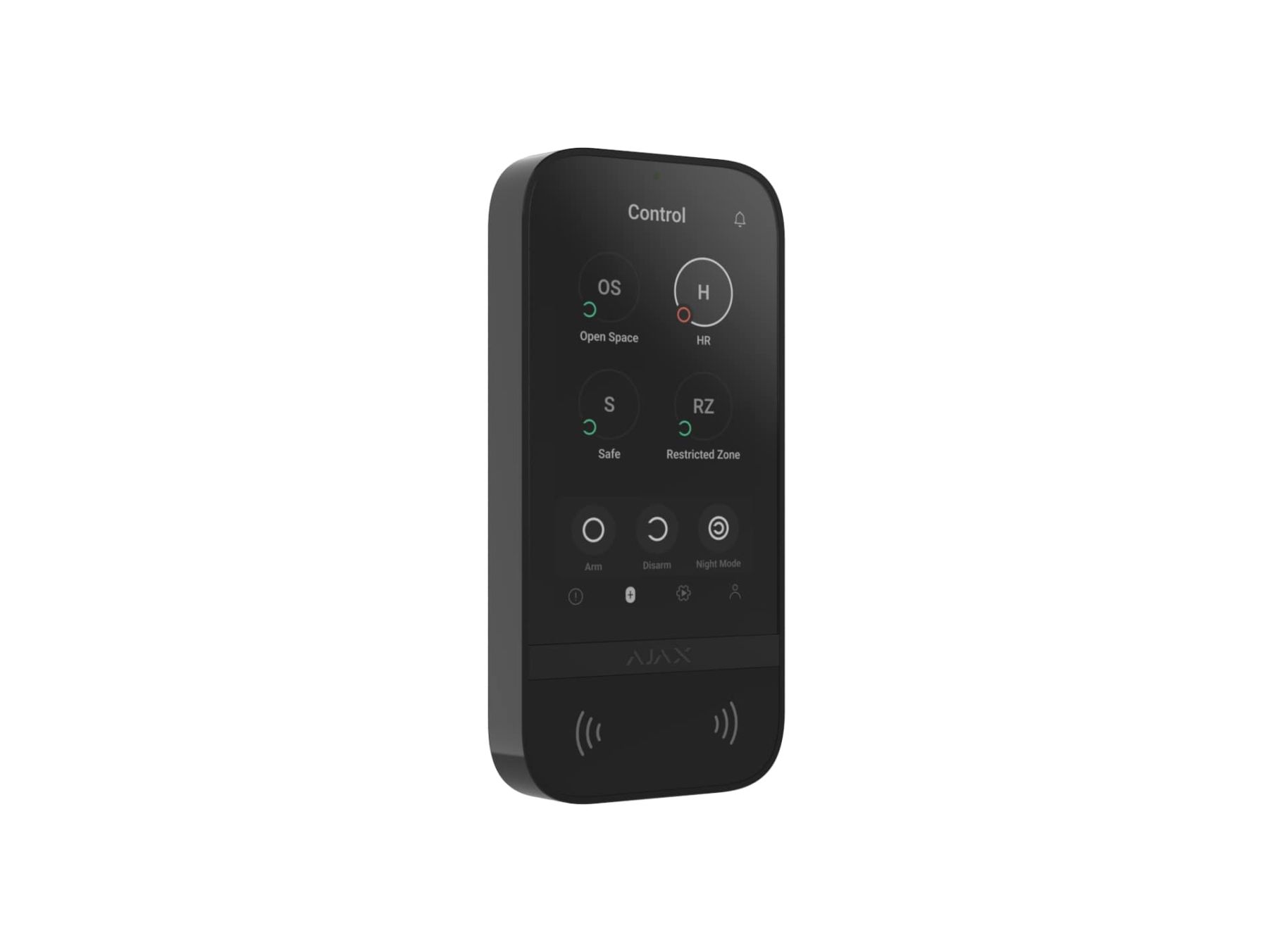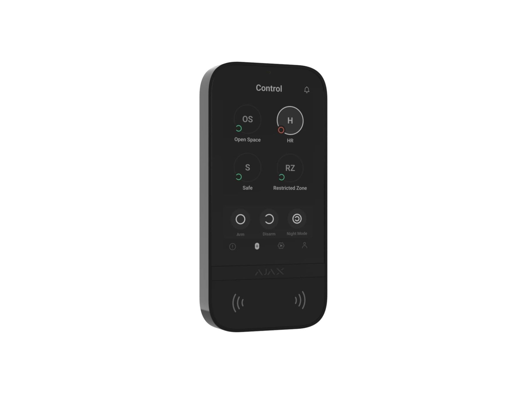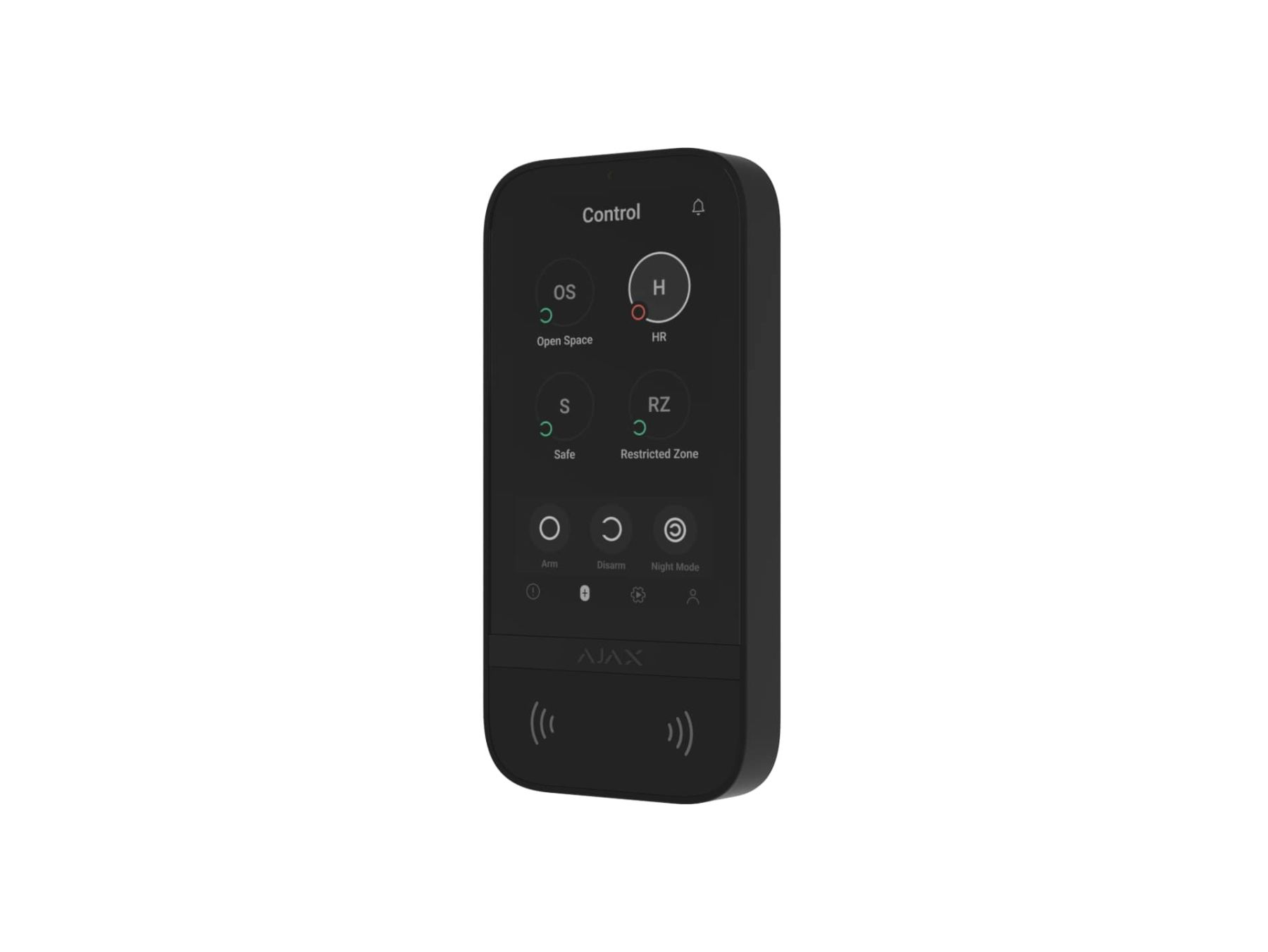 Ajax KeyPad TouchScreen активируется при приближении руки к нему и имеет автоматически регулируемую подсветку. Интерфейс отображает элементы управления в стиле приложения Ajax, что облегчает навигацию пользователя. Сенсорный экран позволяет быстро отображать текущее состояние безопасности любой группы устройств.