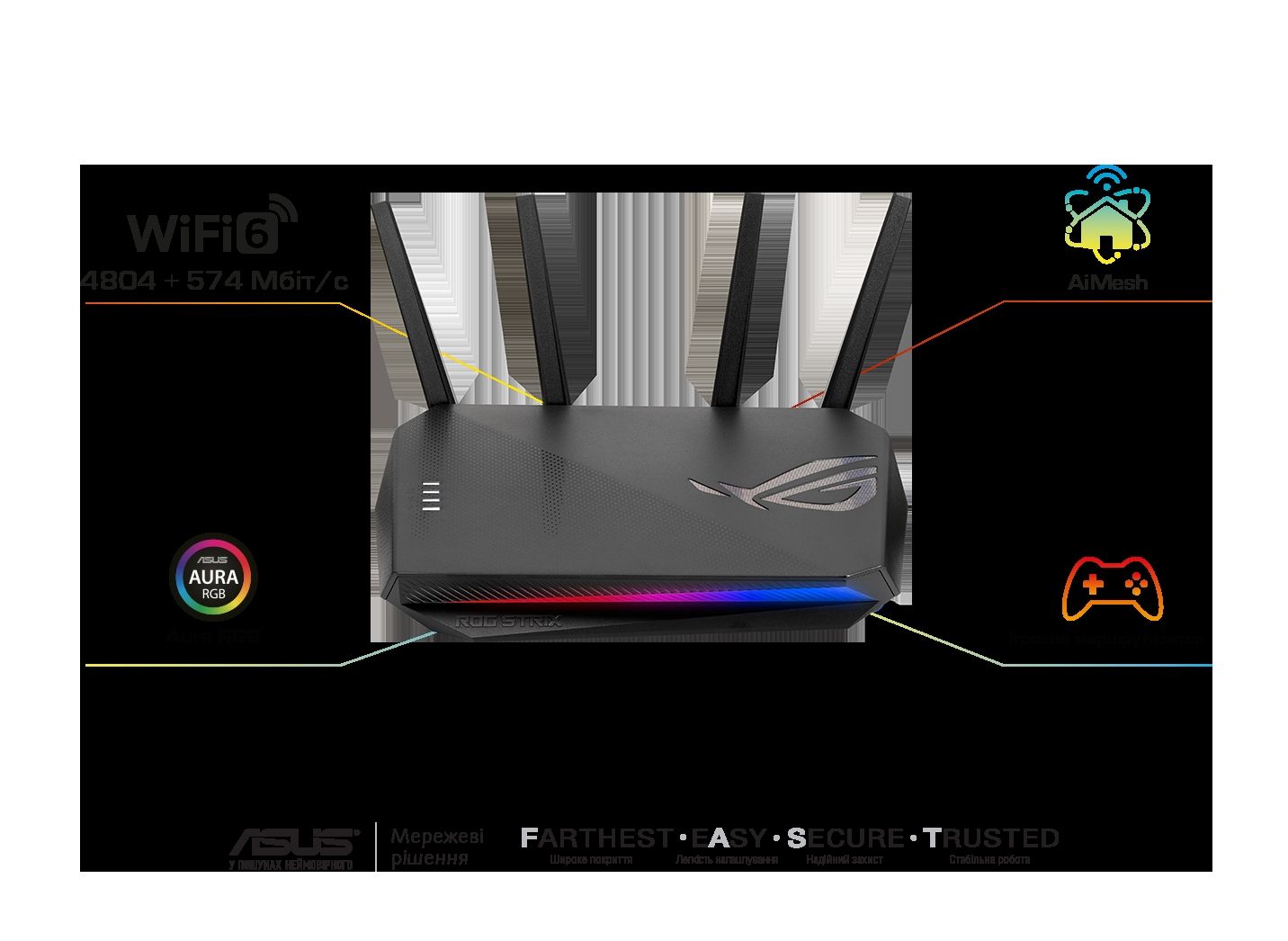 Особенности:Кнопка Reset, Кнопка WPS, AiProtection Pro, Two-Way IPS, Кнопка Power Switch, Доступ по расписанию, ASUS Router APP, OpenNAT (игровой профиль), Блокировка доступа к вредоносным сайтам, ROG First, Игровой порт, Блокировка инфицированных устройств, Функция Game Boost