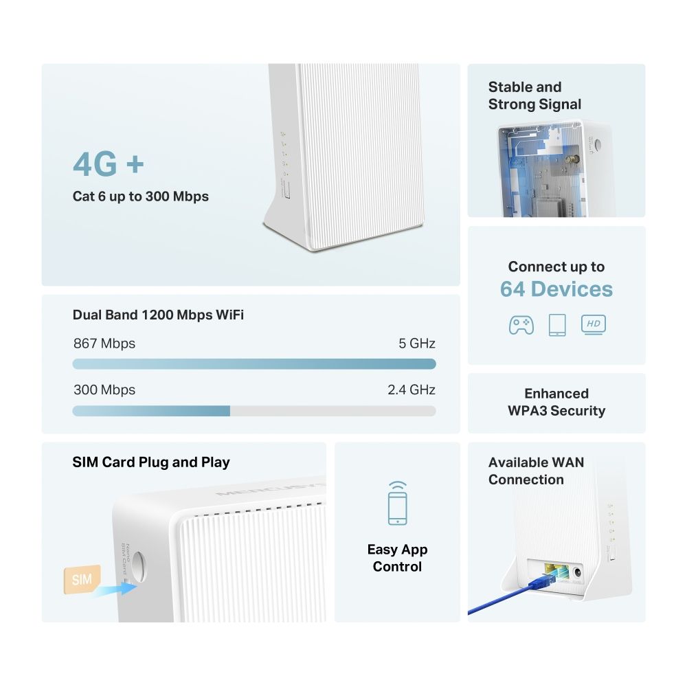 Working as a 4G+ WiFi router, MB230-4G uses 4G+ Cat6 technology to achieve superfast speeds up to 300 Mbps download and 50 Mbps upload. It can also share dual band WiFi network speeds up to 1.2 Gbps. The 2.4 GHz band is perfect for music streaming and online shopping, while the 5 GHz band, with speeds of 867 Mbps, handles bandwidth-intensive HD streaming and gaming.