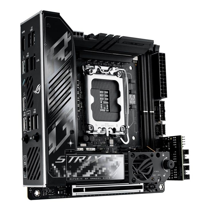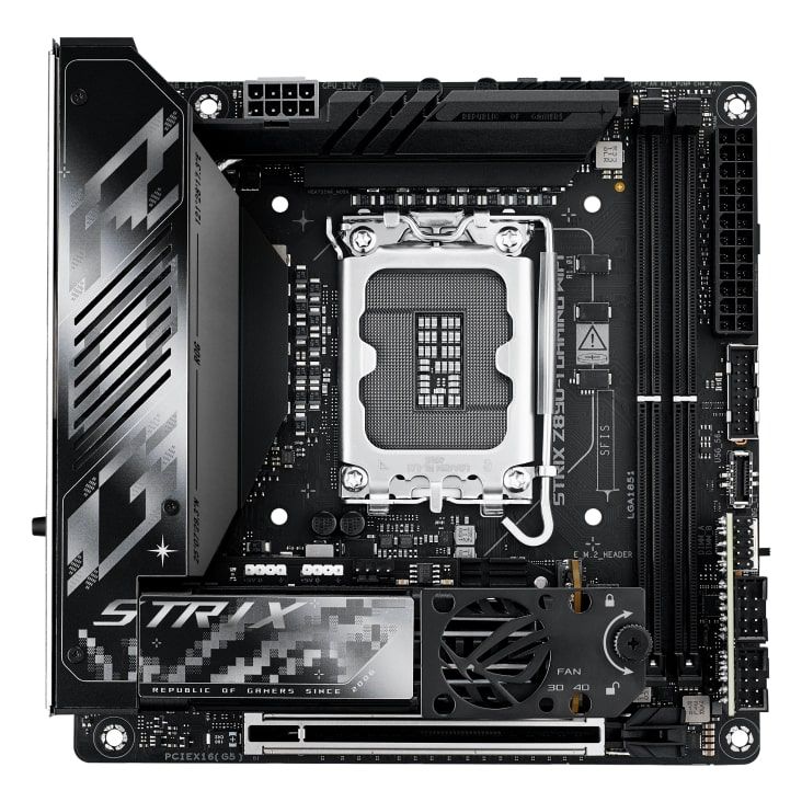 The ROG Strix Z890-I features a sleek, minimalist design that blends effortlessly with various system components. Its deep black PCB and metallic heatsinks give it a bold, intense look, while the L-shaped backplate adds both style and practical protection against sharp edges.