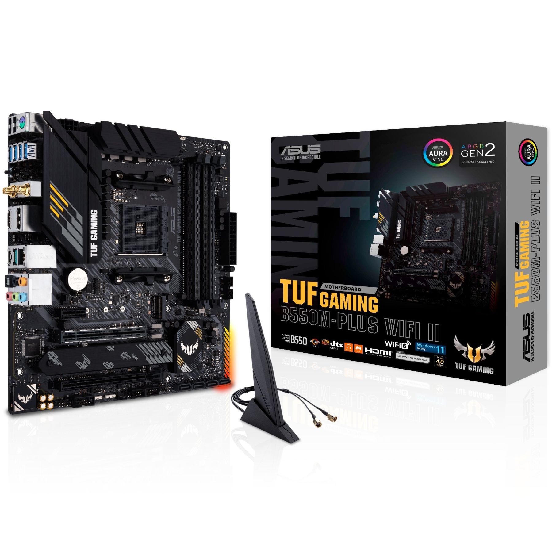 TUF Gaming B550M-Plus WIFI II provides a complete, high-performance gaming package with a long list of features to improve your experience, including ultrafast networking for smoother online gameplay, pristine audio with positional cues for FPS gaming, and onboard RGB lighting that syncs with attached accessories to help you create a personalized gaming atmosphere.