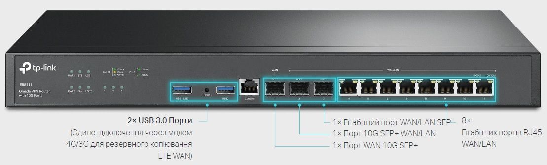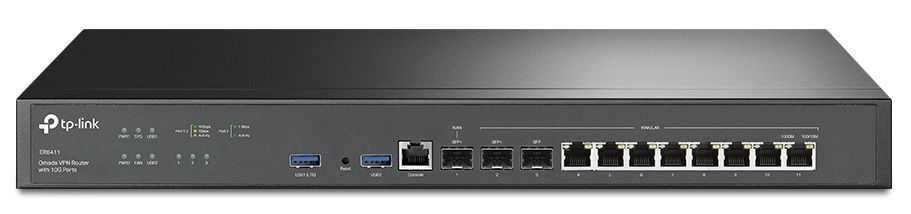 Мультисервисный Маршрутизатор TP-LINK 8xGE LAN/WAN, 1xSFP WAN/LAN, 2x10GE SFP+ WAN/LAN, 2xUSB TP-Link ER8411