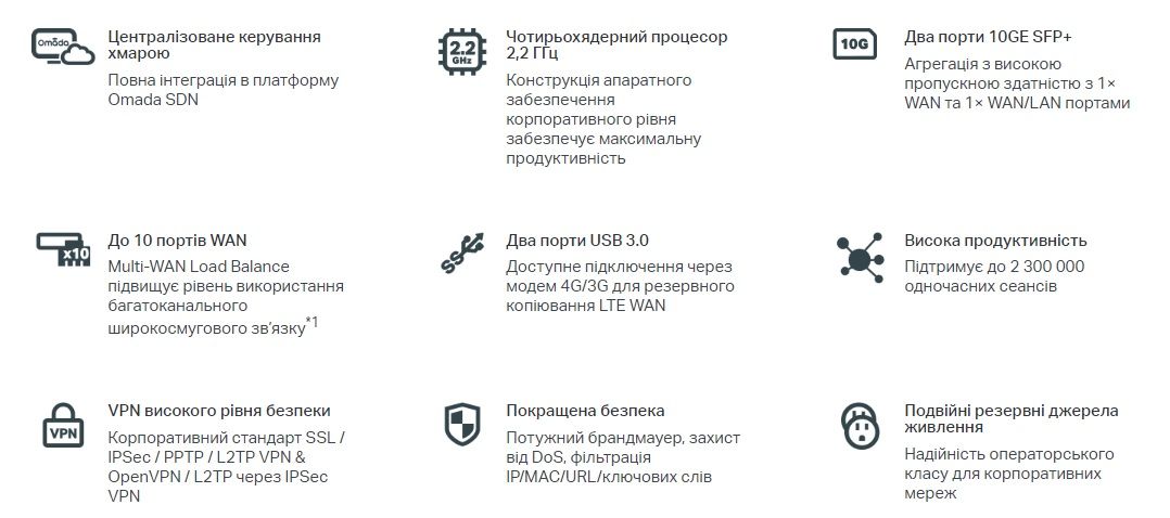 Комплектация:Маршрутизатор, Шнур питания, Руководство по быстрой установке, Комплект для монтажа в стойку, Шлюз безопасности Omada 10G Multi-WAN ER8411