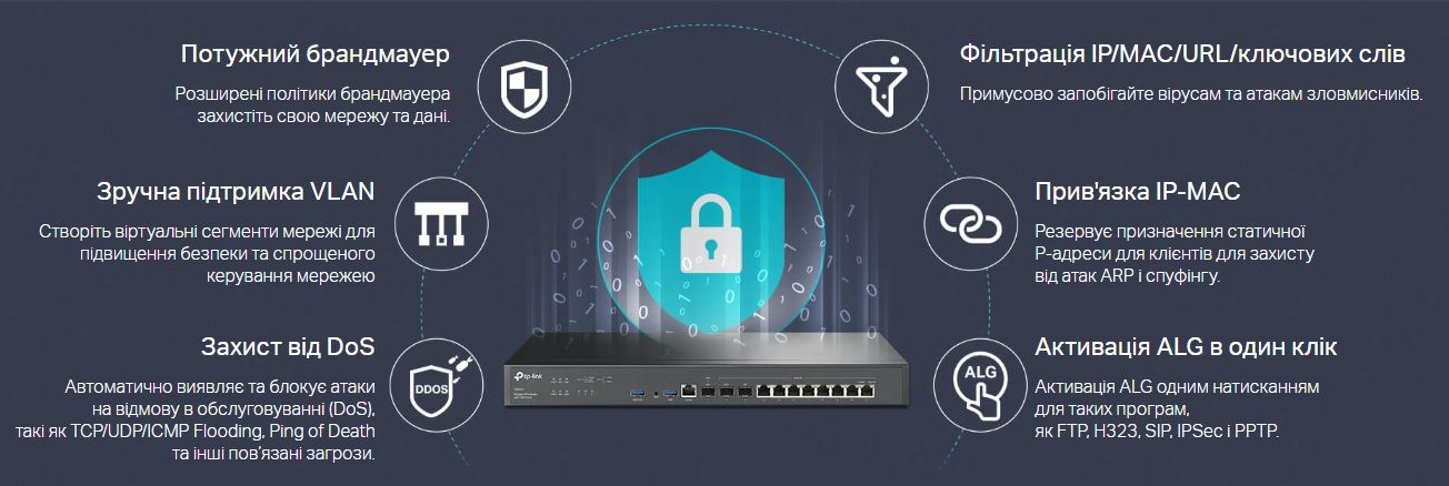 - Набор функций безопасности: мощный межсетевой экран, защита от DoS-атак, фильтрация IP/MAC/URL-адресов, привязка IP- и MAC-адресов, а также активация шлюза прикладного урвоня (ALG) одним нажатием.