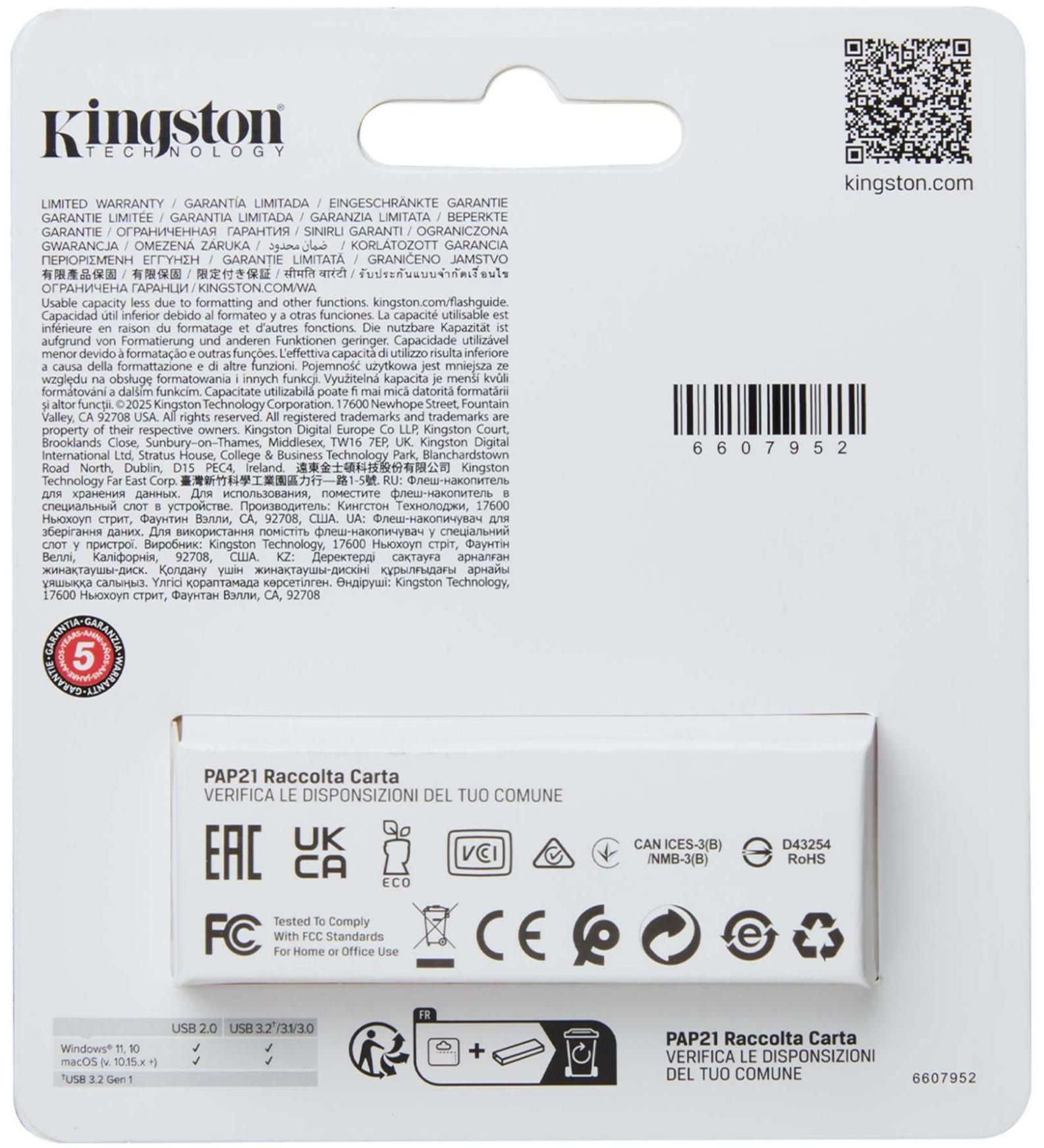 Kingston предоставляет пятилетнюю гарантию на этот продукт, подтверждая его качество и надежность. DataTraveler Exodia 64GB — это сочетание стиля, функциональности и надежности в одном компактном устройстве.