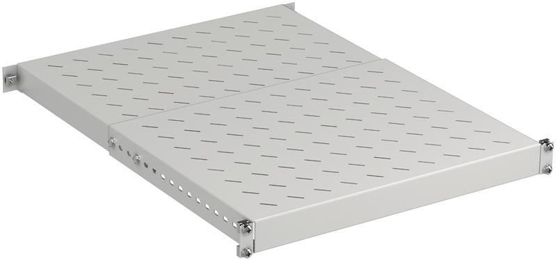 Глубина полки регулируется в диапазоне от 350 до 600 мм, что позволяет адаптировать ее под различные конфигурации шкафов. Конструкция изготовлена из листовой стали толщиной 1,5 мм и окрашена порошковой краской серого цвета (RAL 7035), которая обеспечивает устойчивость к износу и коррозии.